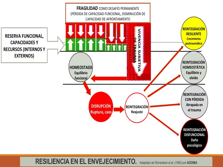 Por tanto, relacionando ambos términos, entendiendo que el envejecimiento es un proceso natural e irreversible, podríamos considerar la fragilidad como el desafío permanente frente al cual la persona mayor pone en marcha mecanismos que le permiten adaptarse a las pérdidas, optimizando sus capacidades y recursos (internos y externos) y manteniendo un adecuado nivel de funcionamiento en las diferentes áreas vitales del desarrollo. De esta forma, el proceso de resiliencia en personas mayores conlleva trascender las pérdidas, reajustarse y continuar con un nuevo desarrollo satisfactorio, manteniendo su esencia (su identidad personal) a pesar de los cambios biológicos, sociales, psicológicos y las renuncias, contribuyendo a su longevidad.